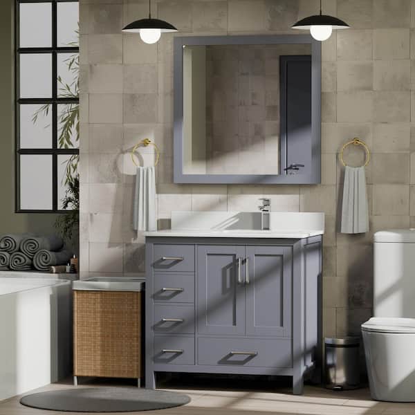 Jacques 36 in. W x 22 in. D Right Offset Dark Grey Bath Vanity, White Quartz Top, and 34 in. Mirror