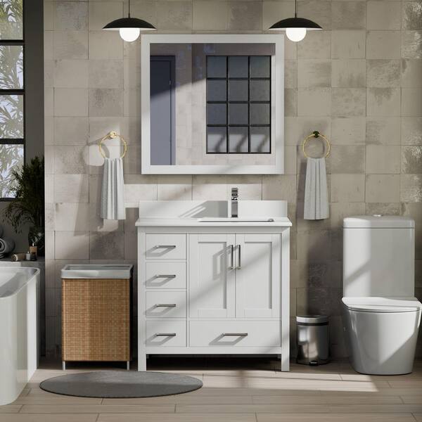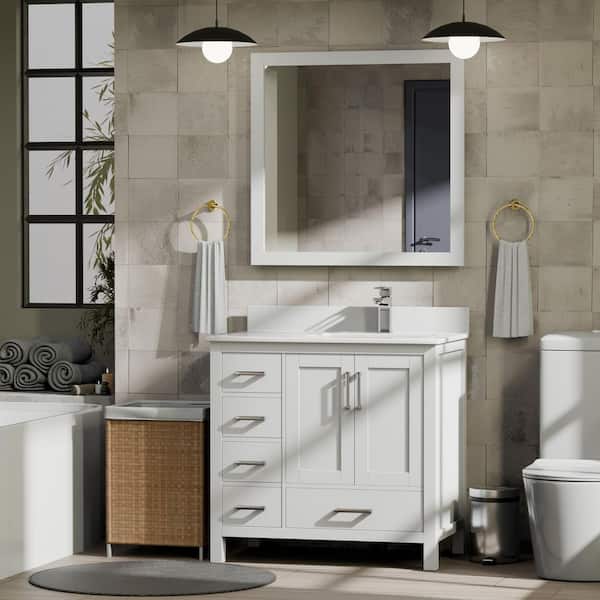 Jacques 36 in. W x 22 in. D Right Offset White Bath Vanity, White Quartz Top, Faucet Set, and 34 in. Mirror