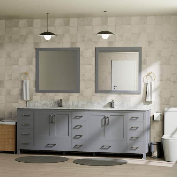 Jacques 84 in. W x 22 in. D Dark Grey Double Bath Vanity, Carrara Marble Top, Faucet Set, and 34 in. Mirrors