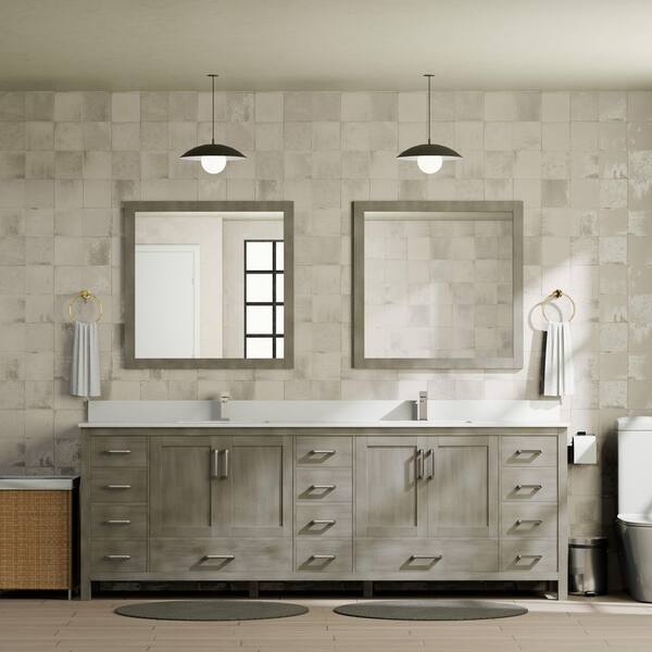 Jacques 84 in. W x 22 in. D Distressed Grey Bath Vanity, Cultured Marble Top, Faucet Set, and 34 in. Mirror