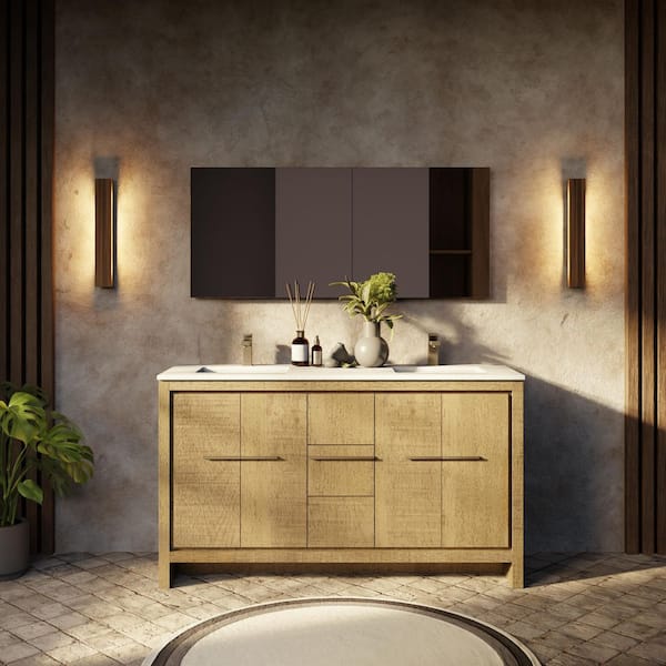 Lafarre 60 in W x 20 in D Rustic Acacia Double Bath Vanity, White Quartz Top and Gun Metal Faucet Set