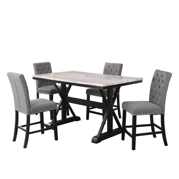 Lidia 5-Piece Faux Marble Counter Height Dining Set with Gray Linen Fabric Chairs.