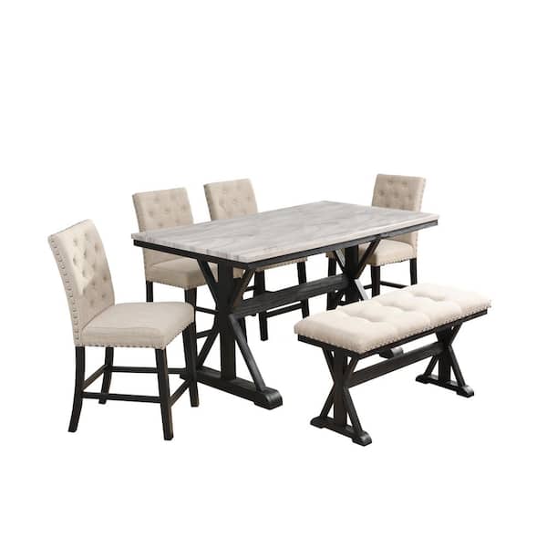 Lidia 6-Piece Faux Marble Counter Height Dining Set with Beige Linen Fabric Chairs and Bench.