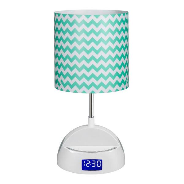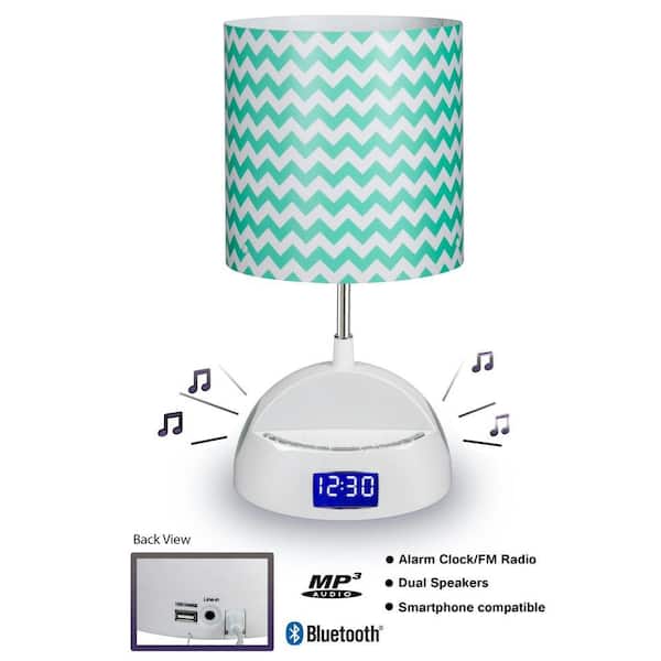 Rhythm 15.25 in. White Bluetooth Speaker Lamp with Alarm Clock, FM Radio, USB Charging Port and Aqua Cheveron Shade