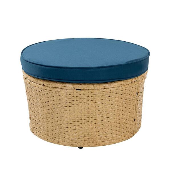 Light Brown Wicker Round Outdoor Day Bed with Navy Blue Cushions