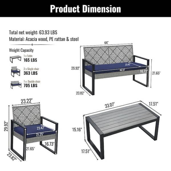 Light Gray 4-Piece Wicker Outdoor Sectional Set with Blue Cushions