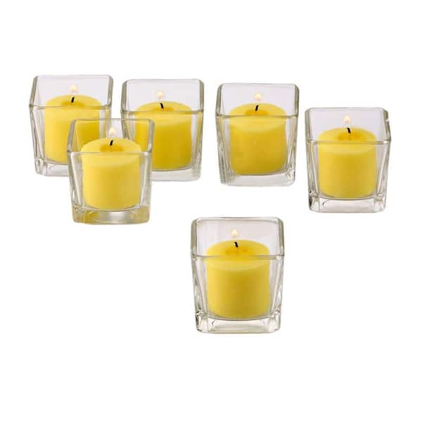 Clear Glass Square Votive Candle Holders with Yellow Votive Candles (Set of 12)
