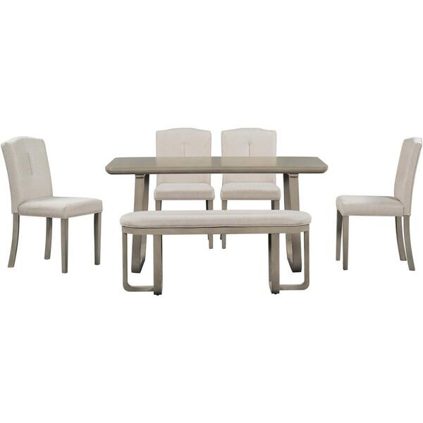 Light Khaki 6-Piece Wood Dining Table Set Upholstered Chairs Set of 4-Foam-covered Seat Backsand Cushions Bench