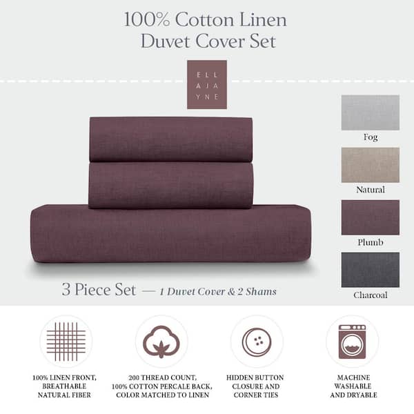 Linen Cotton 3-piece King/Cal King Sized, Plum Colored Duvet Cover Set