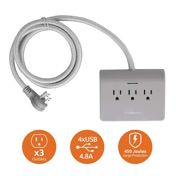3-Outlet 4-USB Power Dock Surge Protector with 5 ft. Textile Cord and Grounded Plug in Gray