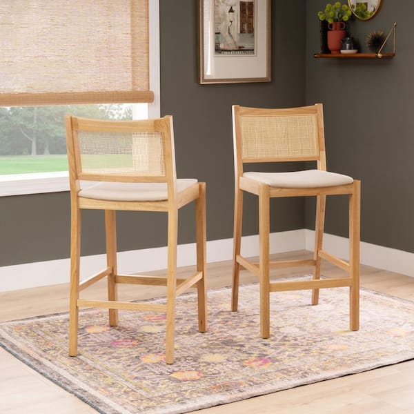 Lewis 29.25 in. Natural Cane Low Back Wood Bar Stool with Fabric Seat Set of 2