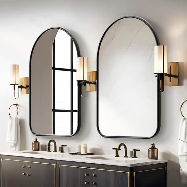 23 in. W x 31 in. H Arched Metal Framed Pivoted Bathroom Wall Vanity Mirror Round Corners in Black