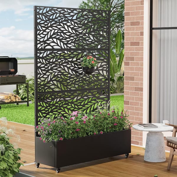 72 in. H x 47 in. W Rectanglar Black Outdoor Metal Privacy Screen Planter Box Wall Decor in Leaf Pattern