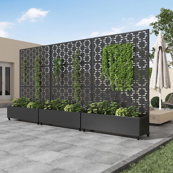 72 in. x 47 in. Black Outdoor Metal Privacy Screen Raised Planter Box Wall Decor