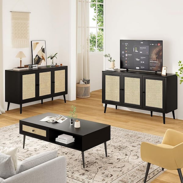 Black 47 in. Display Cabinet with 3 Rattan Doors, Kitchen Storage Cabinet
