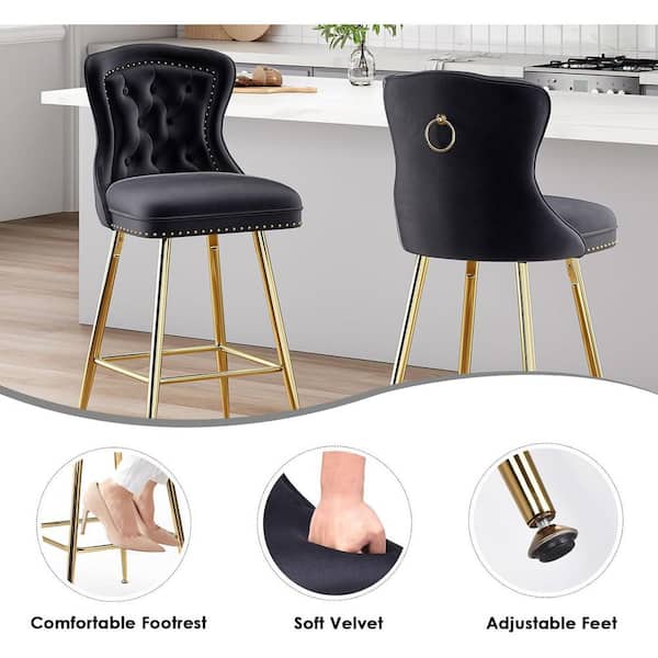 Black Velvet Counter Height Bar Stool with Metal Legs (Set of 2)