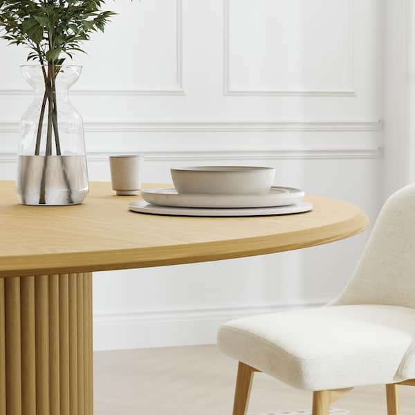 Cylindrical Natural Colored Wood 60" Column Base Recessed Roumded Duckbill Edge Dining Table for 8