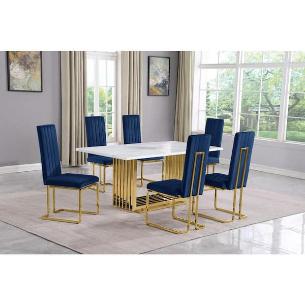 Lisa 7-Piece Rectangle White Marble Top Gold Stainless Steel Dining Set With 6-Navy Blue Velvet Gold Chrome Iron Chairs