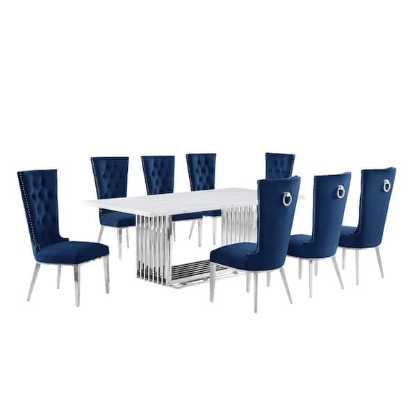 Lisa 9-Piece Rectangular White Marble Top Stainless Steel Base Dining Set With 8-Navy Blue Velvet Fabric Chairs