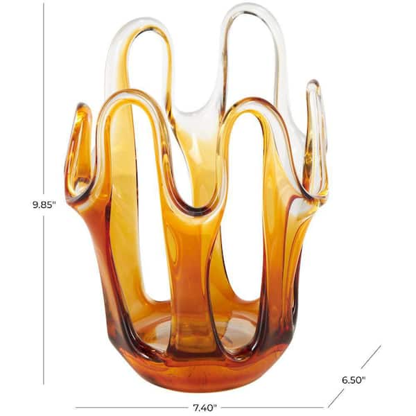 10 in. Orange Ombre Glass Abstract Decorative Geometric Vase with Wavy Oval Cutouts