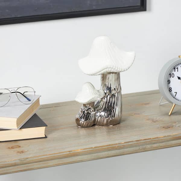 10 in. Silver Ceramic Mushroom Sculpture with White Tops and Textured Grooves
