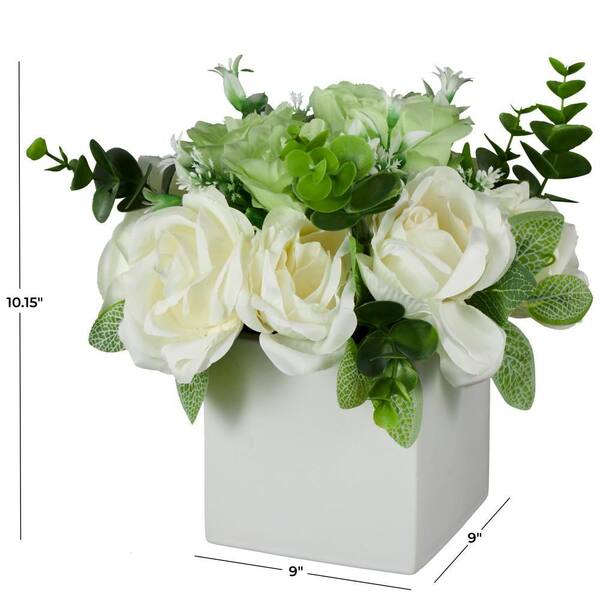 10 in. White Artificial Flower with Green Leaves and Square Ceramic Vase