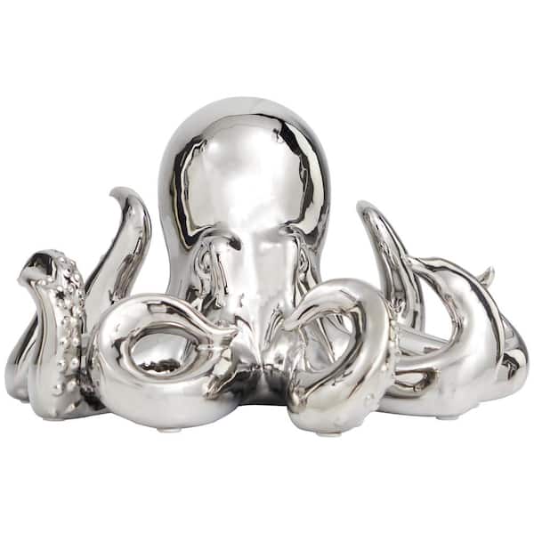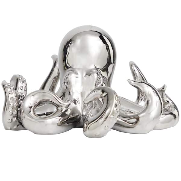11 in. x 7 in. Silver Ceramic Octopus Sculpture with Textured Tentacles