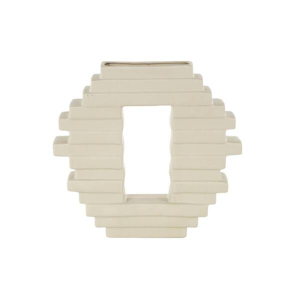 12 in. Cream Ceramic Geometric Decorative Vase with Rectangular Center Cutout
