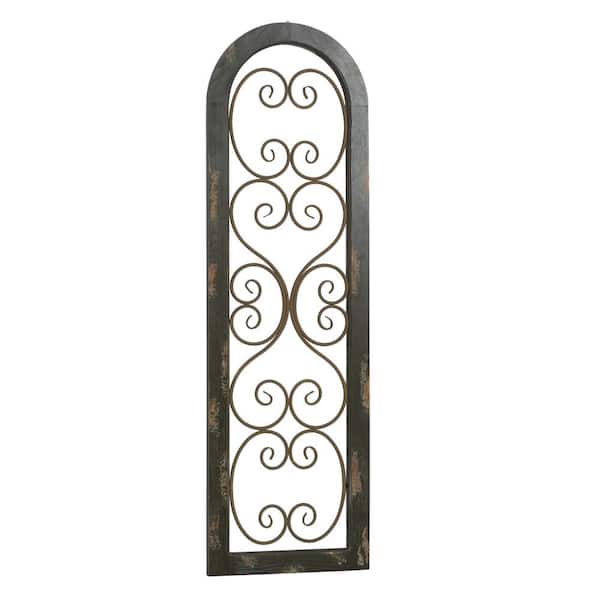 15 in. x 48 in. Wood Brown Arched Window Inspired Scroll Wall Decor with Metal Scrollwork Relief