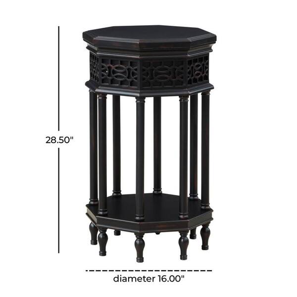 16 in. Black Octagon Geometric Large Octagon Wood End Table with Elegant Carved Pattern and 8 Turned Pillar Legs