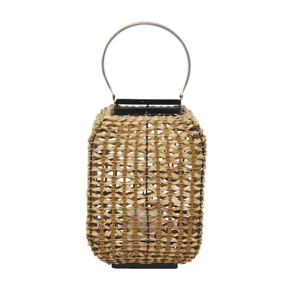 16 in. H Brown Dried Plant Handmade Decorative Candle Lantern with Glass Holder and Handle