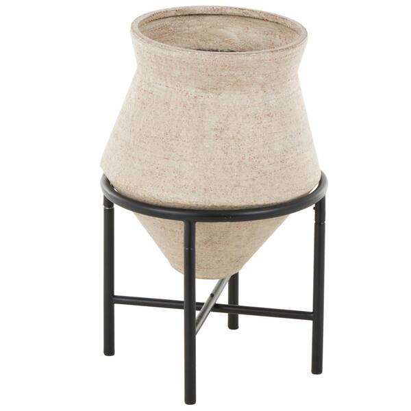 20 in. Beige Round Wide Decorative Vase with Black Metal Stands
