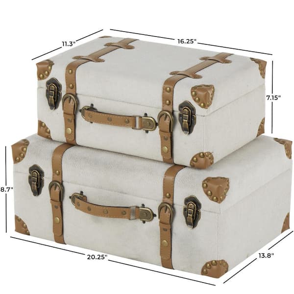 20 in. Light Gray Wooden Vintage Storage Trunk with Brown Leather Accents and Bronze Latches (Set of 2)