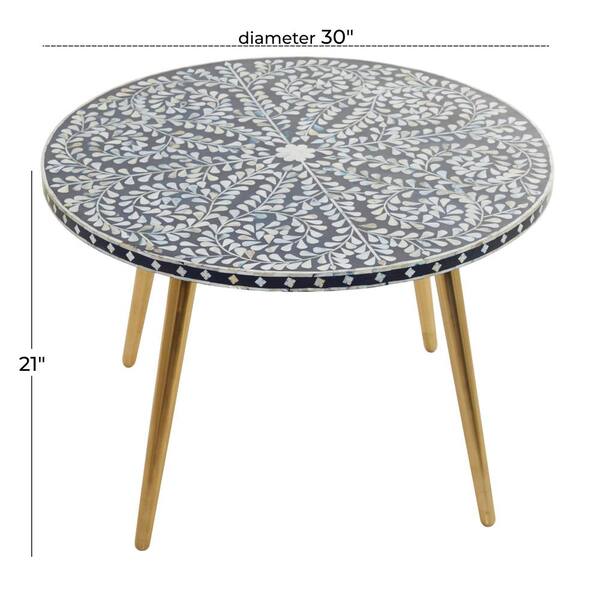 30 in. x 21 in. Round Black Wood Coffee Table with Irridescent White Shell Patterned Inlay and Gold Metal Base