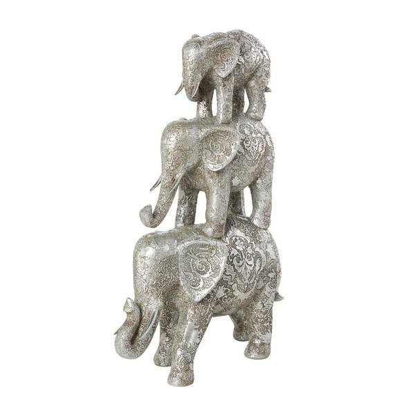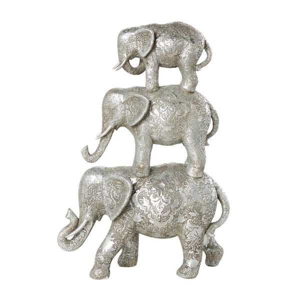 4 in. x 18 in. Silver Polystone Engraved Floral Stacked Elephant Sculpture