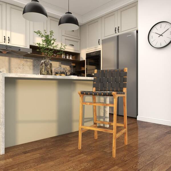 40 in. Black Teak Wood Woven Leather Seat and Back Bar Stool with Beam Footrest