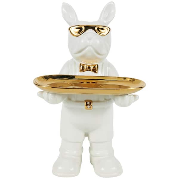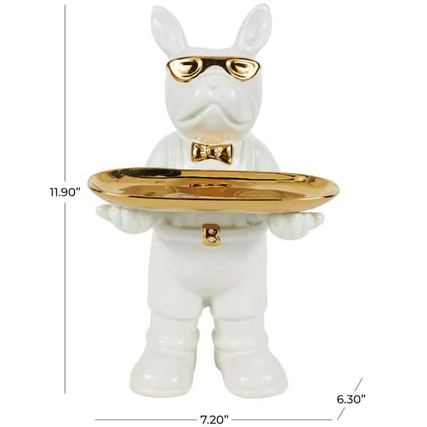 6 in. x 12 in. White Ceramic Bulldog Sculpture with Gold Accents