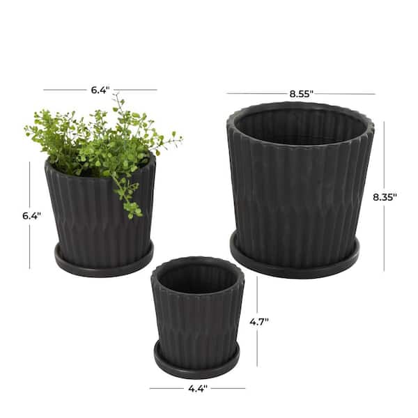 8 in. 6 in. and 5 in. Small Black Ceramic Ribbed Planter with Attached Saucer (3- Pack)