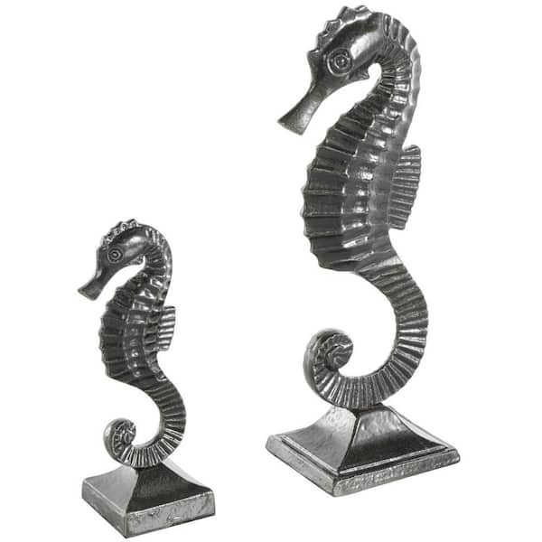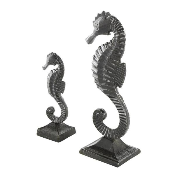 Black Aluminum Metal Sea Horse Sculpture with Square Bases (Set of 2)
