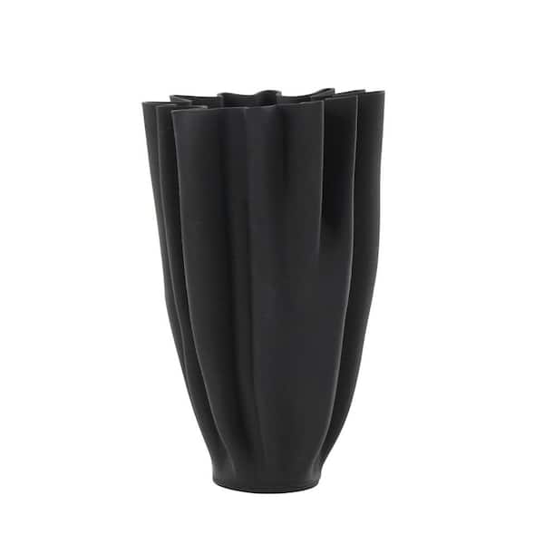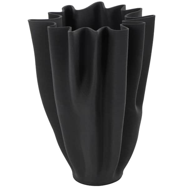Black Dimensional Ribbed Tulip Ceramic Abstract Decorative Vase with Angular Rim