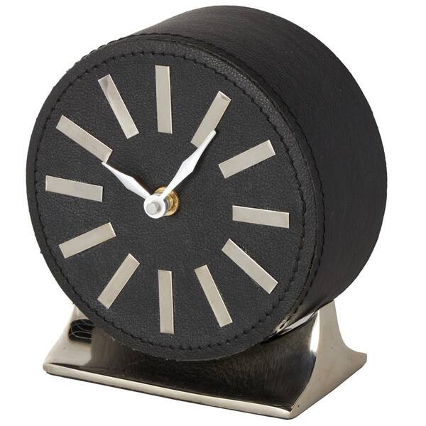Black Faux Leather Round Clock with Silver Rectangular Base
