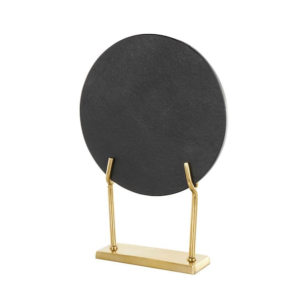 Black Marble Textured Disk Abstract Sculpture with Gold Stand