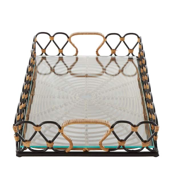Black Metal Circular Woven Decorative Tray with Glass Base