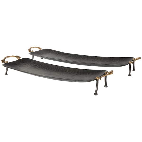 Black Metal Textured Curved Decorative Tray with Elevated Feet and Gold Scroll Vine Handles (Set of 2)