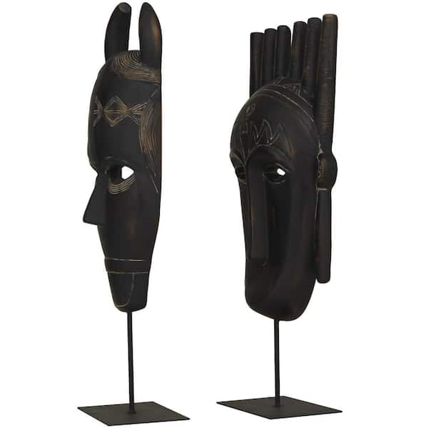 Black Polystone Handmade Carved Mask Sculpture (Set of 2)