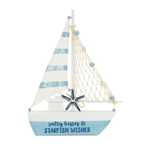 Blue Resin Sail Boat Sculpture with Netting and Starfish Details (Set of 3)