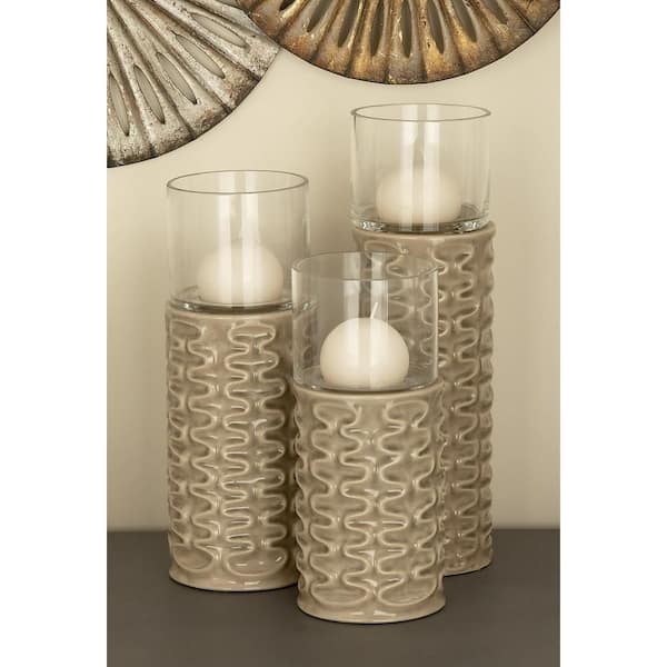 Brown Ceramic and Glass Ridged Candle Holders (Set of 3)