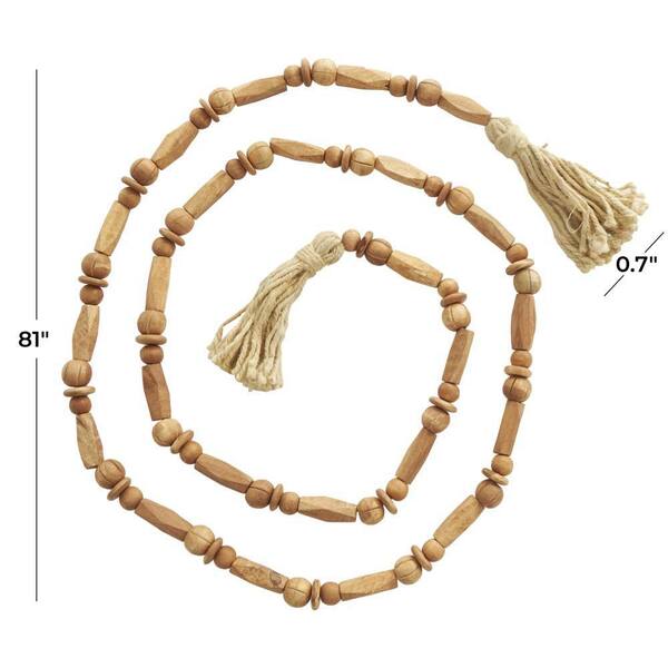 Brown Handmade Mango Wood Rectangle Carved Geometric Long Beaded Garland with Tassel