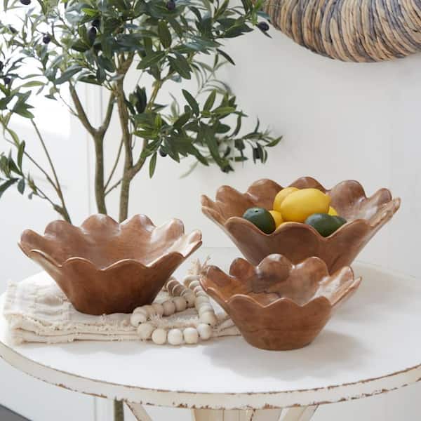 Brown Handmade Teak Wood Floral Decorative Bowl (Set of 3)