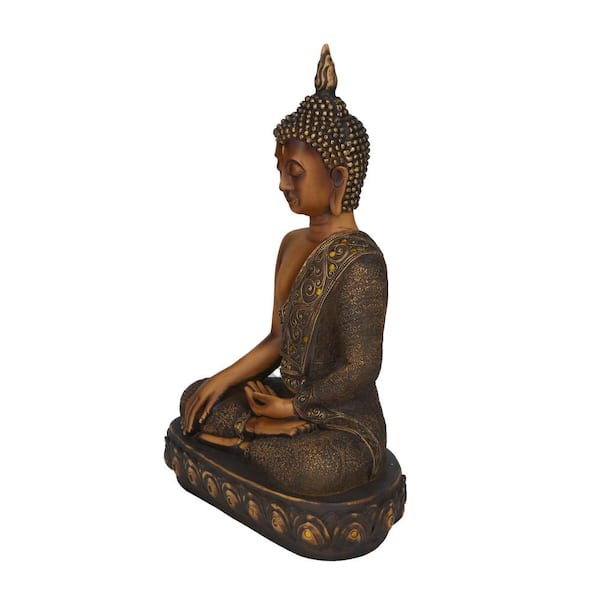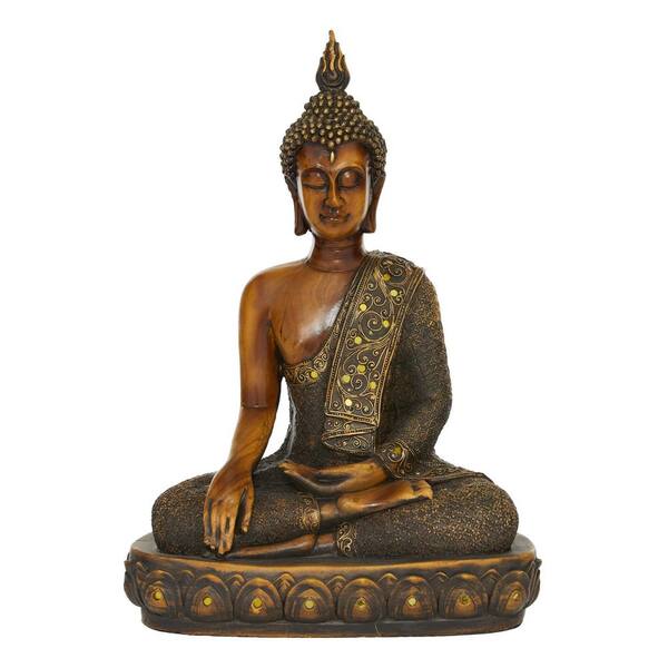 Brown Polystone Meditating Buddha Sculpture with Engraved Carvings and Relief Detailing